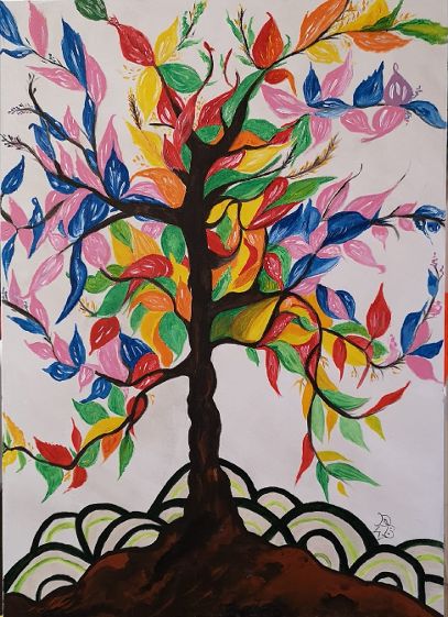 L’albero si erge a solleticare il cielo, raccontando della vita, allungandosi in rami in cui sono avvinghiati foglie di diversi color: il blu, per ricondurci alla meditazione; il rosa per ricordarci di amare; il verde che ci riporta ad avere attenzione nei confronti della natura; il rosso per invitarci a vivere le nostre passioni, senza soffocarle; il giallo per infonderci energia.