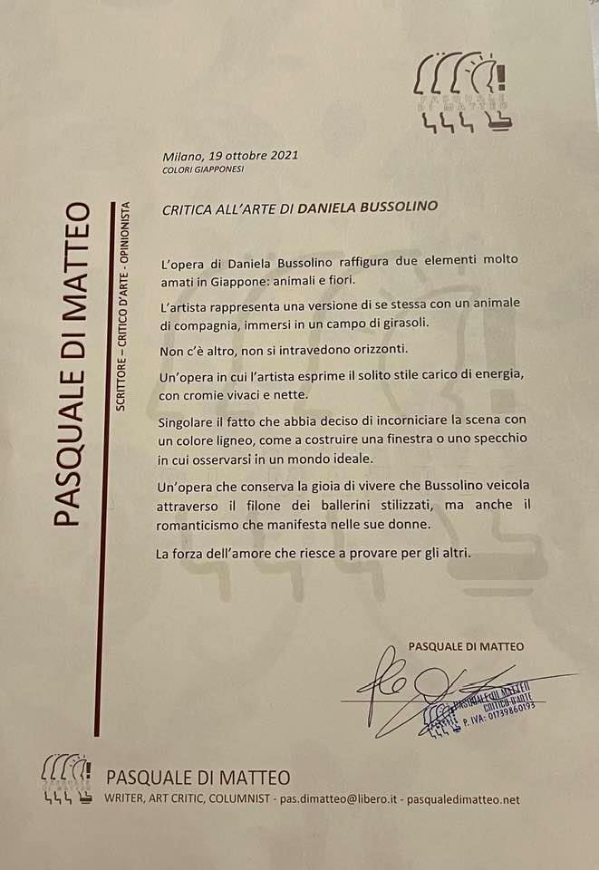 Nelle prossime settimane, sarà realizzato un video sull’arte di Daniela Bussolino, con la critica di Pasquale Di Matteo, che partirà proprio dall’opera esposta in galleria, per poi mostrare altre opere dell’artista, posizionate in ambienti virtuali. (Per avere un’idea, basta guardare gli altri video già realizzati sul Canale YouTube PENSIERI ARMONICI).