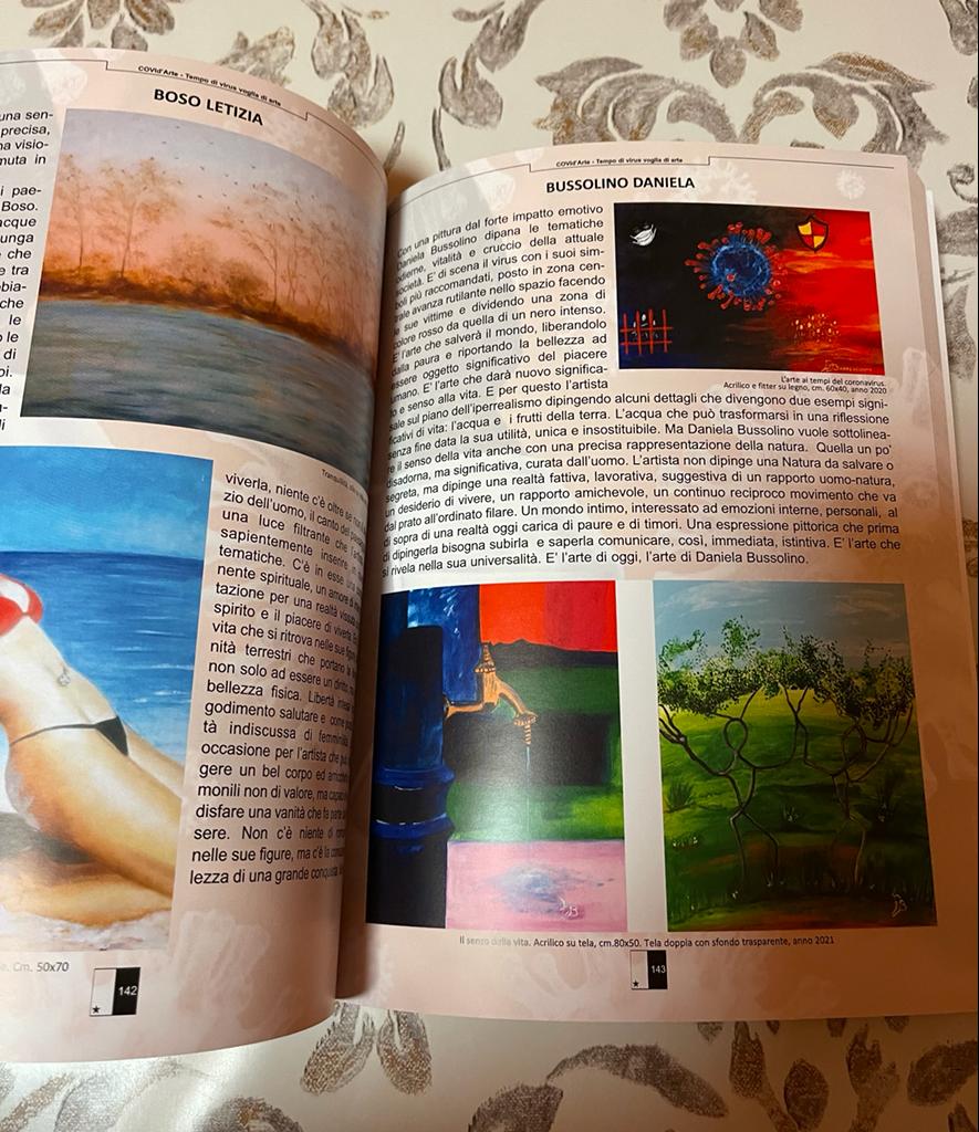 Con lo stesso spirito, Daniela Bussolino ha deciso di entrare a far parte di due cataloghi a tema: Arte al Tempo del Coronavirus, di Skira editore, presentato domenica 12 dicembre al Teatro Parenti, a Milano, e Covid’Arte – Tempo di virus, voglia di arte, edito da Il Quadrato, a cura di Giorgio Falossi e Lorenzo Cipriani.