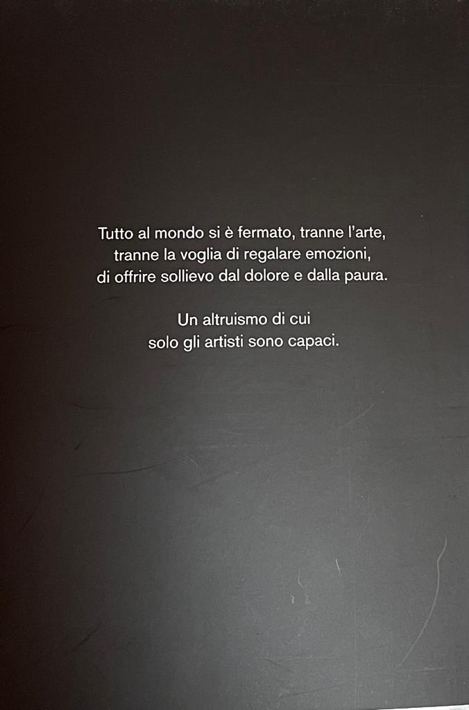 Sulla quarta di copertina del catalogo Arte al tempo del Coronavirus, edito da Skira, c’è scritto: “Tutto al mondo si è fermato, tranne l’arte, tranne la voglia di regalare emozioni, di offrire sollievo dal dolore e dalla paura. Un altruismo di cui solo gli artisti sono capaci.”