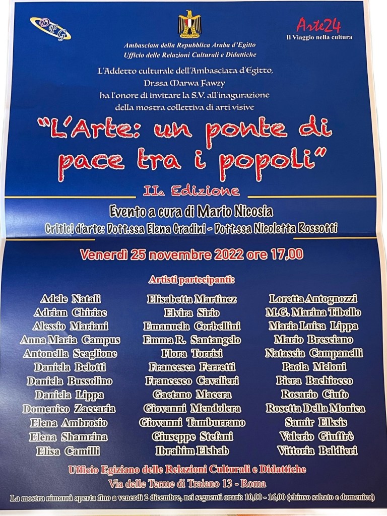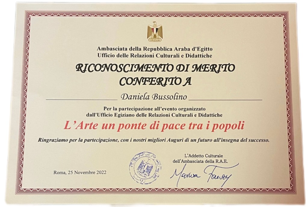 In novembre, Daniela Bussolino è stata protagonista anche in Sicilia, dove ha ricevuto il “Premio Platinum Palette”. Altro magico evento quello con la storica e critica d’arte Nicoletta Rossotti, presso l’ambasciata egiziana a Roma, “L’arte, un ponte di pace tra i popoli”.