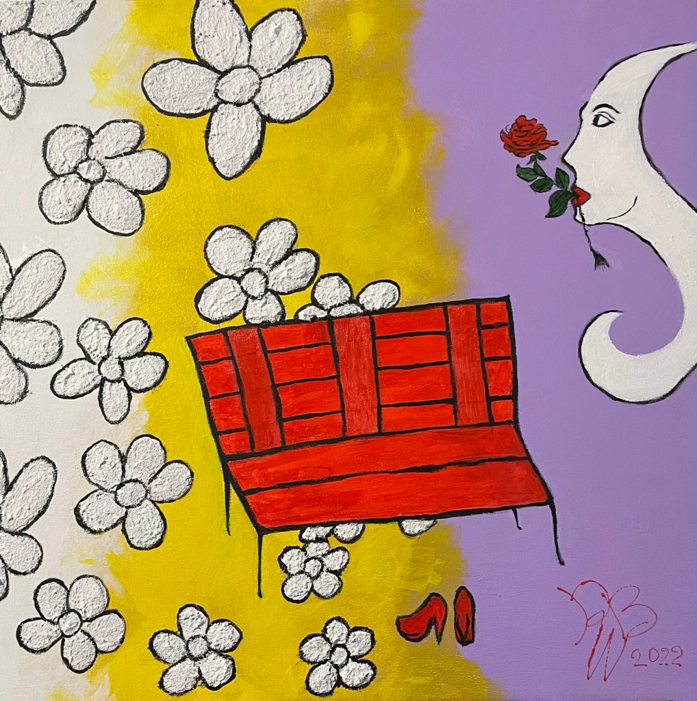Un dipinto in cui figurano pochi elementi, ma tutti iconici: le scarpette rosse, una panchina dello stesso colore, una rosa tenuta tra le labbra da una donna che sembra una maschera carnevalesca, ma anche una Luna stilizzata nel cielo.