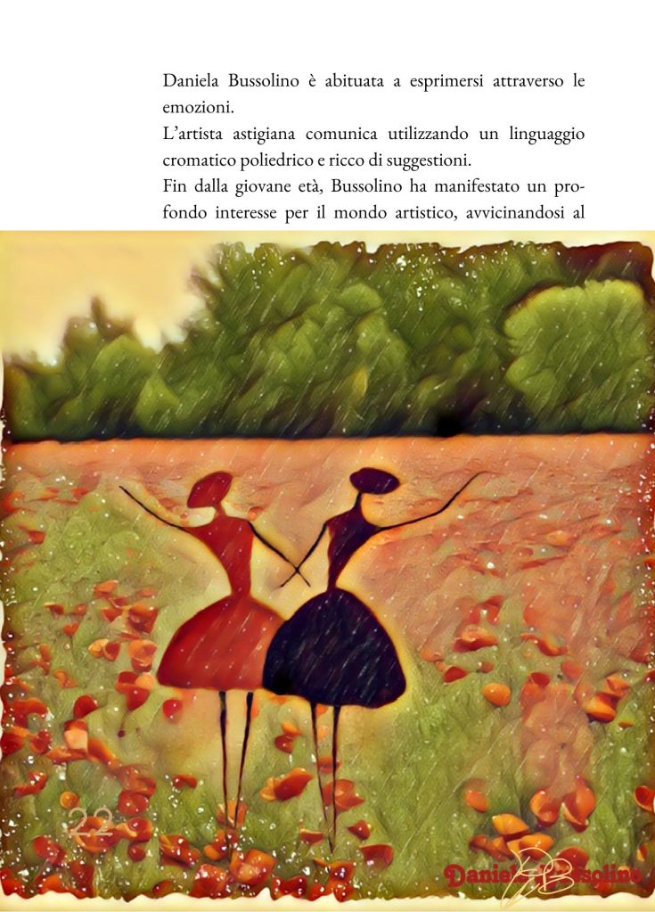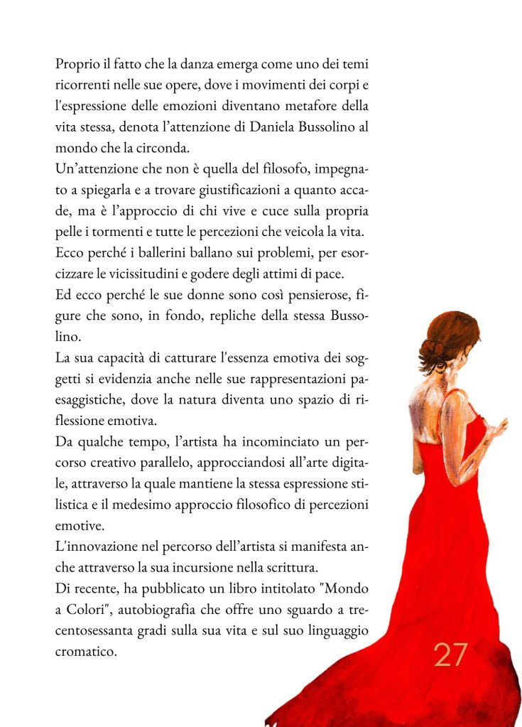 Nel volume, uscito a metà luglio, Di Matteo ha scritto di Daniela Bussolino che “è abituata a esprimersi attraverso le emozioni” e che “comunica utilizzando un linguaggio cromatico poliedrico e ricco di suggestioni”.