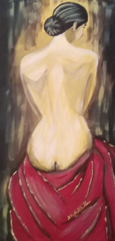 La figura di spalle avvolta in un drappeggio rosso non nasconde il volto per timore, ma perché la sua vulnerabilità è una forma di potere e mostrare la schiena è un atto di fiducia, è aprirsi al mondo senza garanzie, accettando di essere osservati nella propria intima verità.
