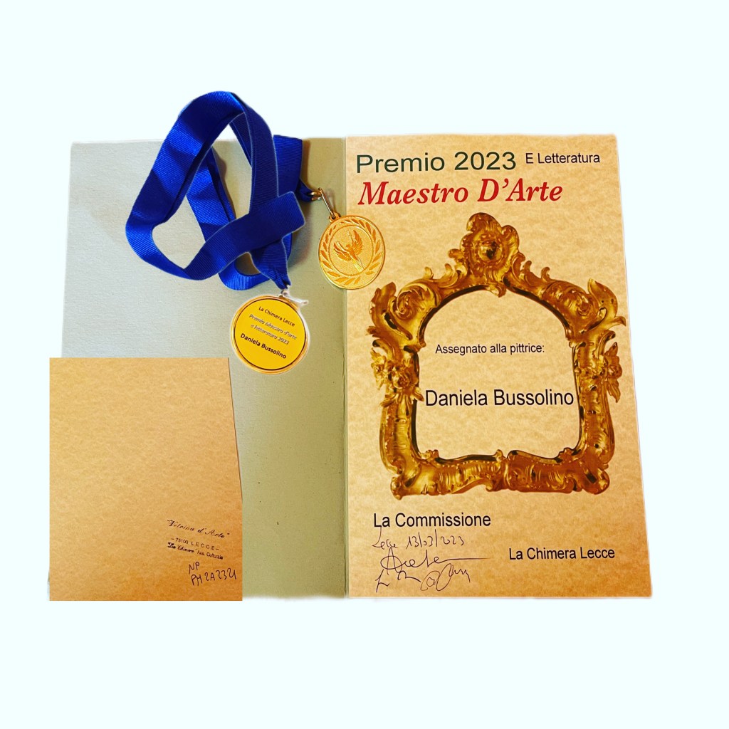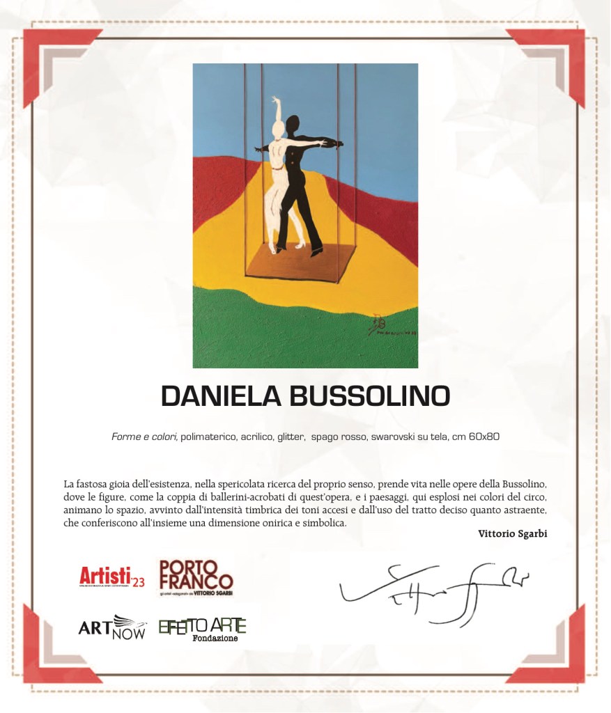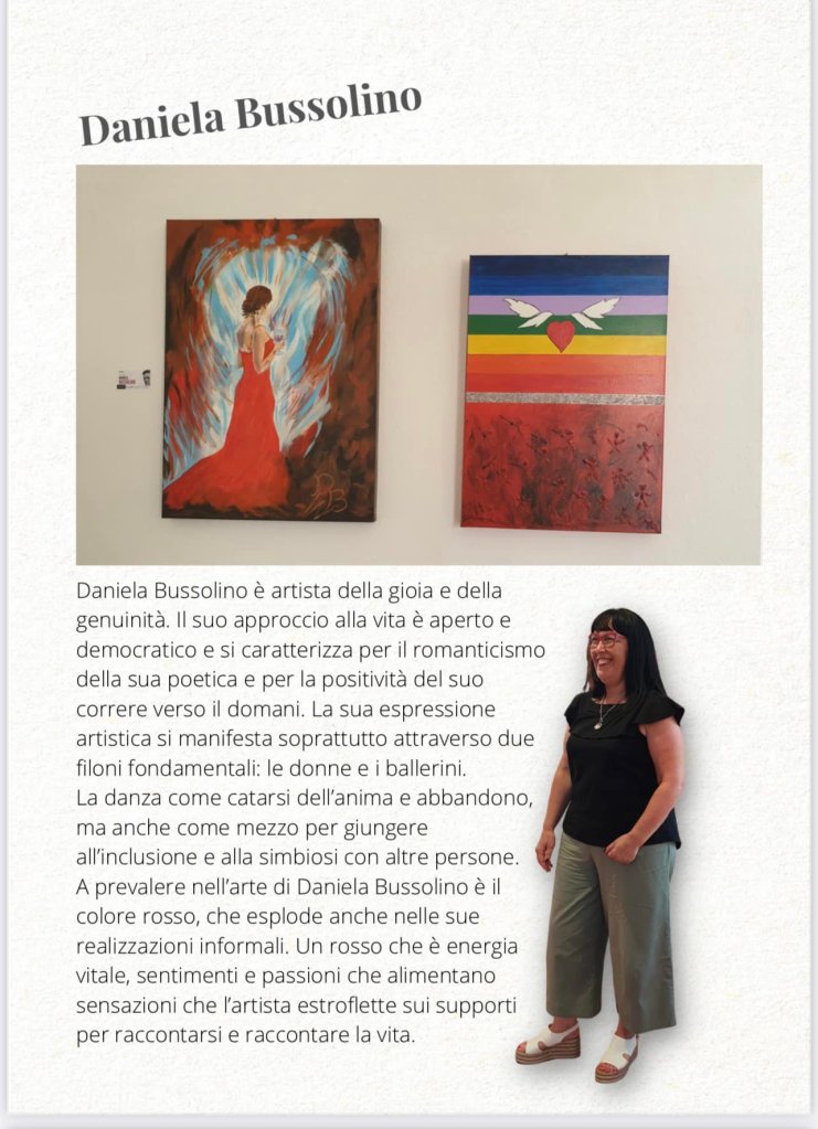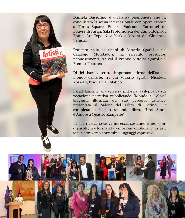 Daniela Bussolino è un’artista conosciuta per la sua capacità di combinare tecniche pittoriche tradizionali e non con un forte messaggio emotivo.