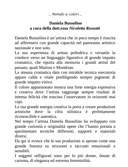 Daniela Bussolino, dunque, ha apposto la sua firma visuale sotto una forte richiesta di pace, consentendo la pubblicazione di una sua opera in un catalogo che parla di cultura e di vita poiché si scaglia contro la guerra e la violenza.