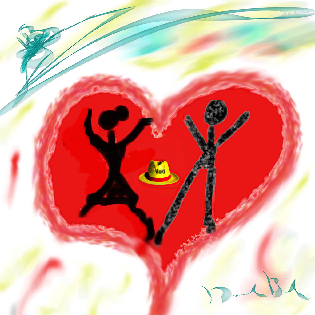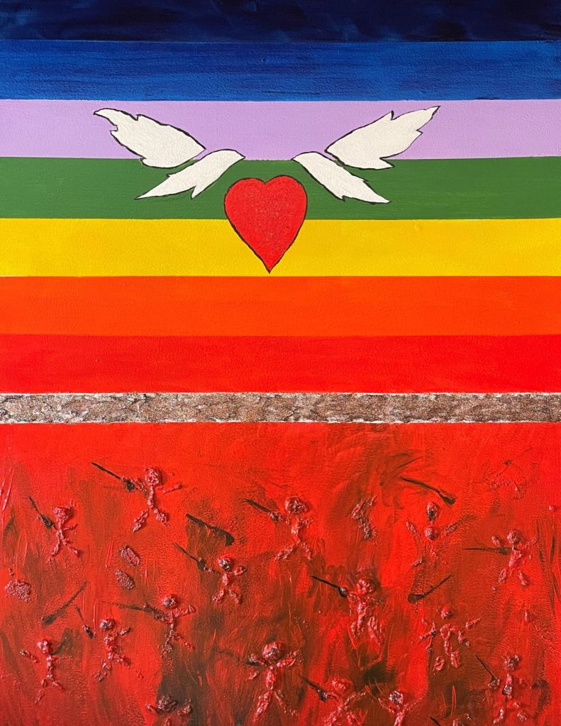 Al centro della composizione, un cuore rosso con ali bianche emerge come simbolo di pace e libertà, posato su un campo di colori che gradualmente sfumano dall’armonia alla discordia.